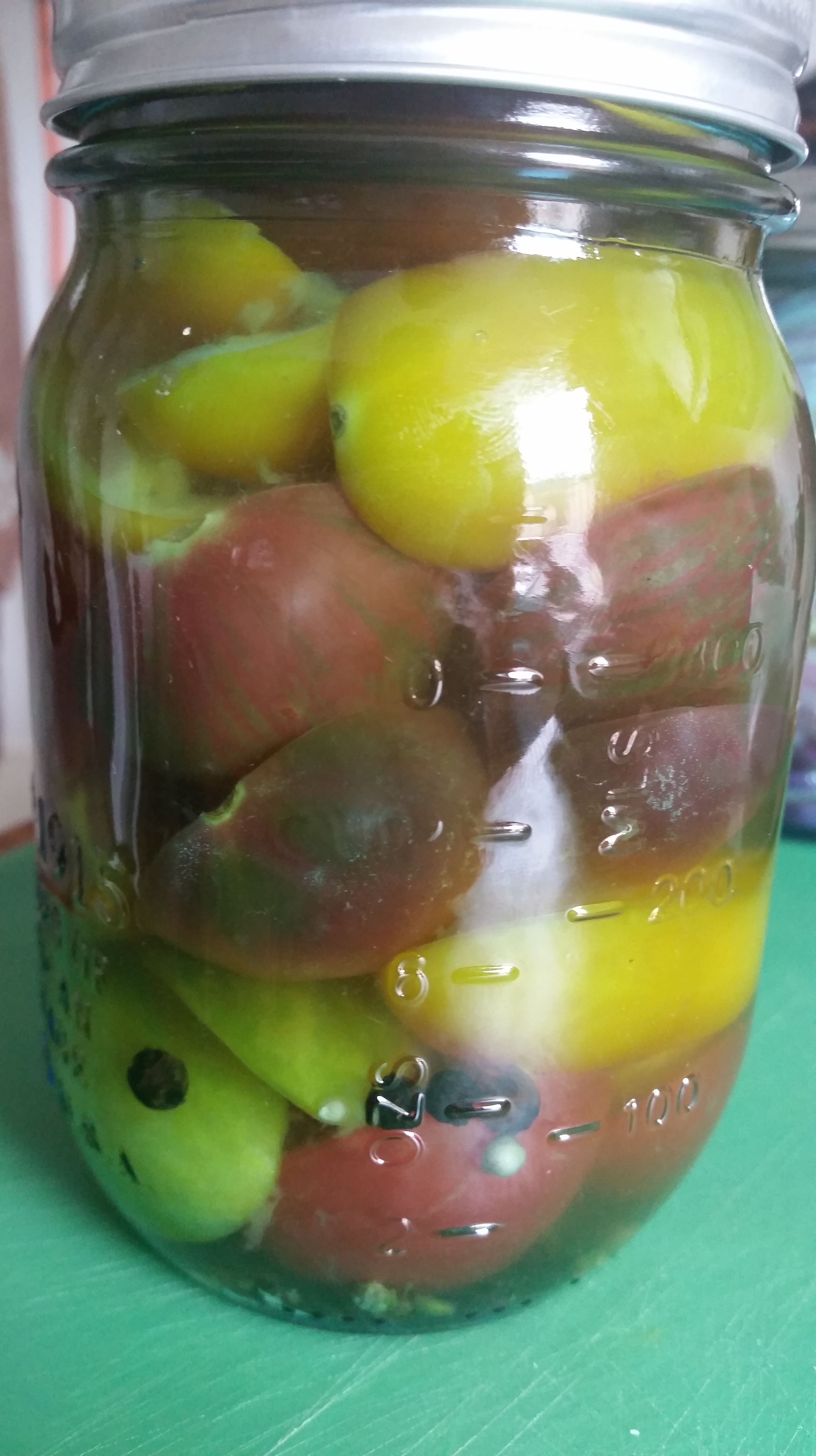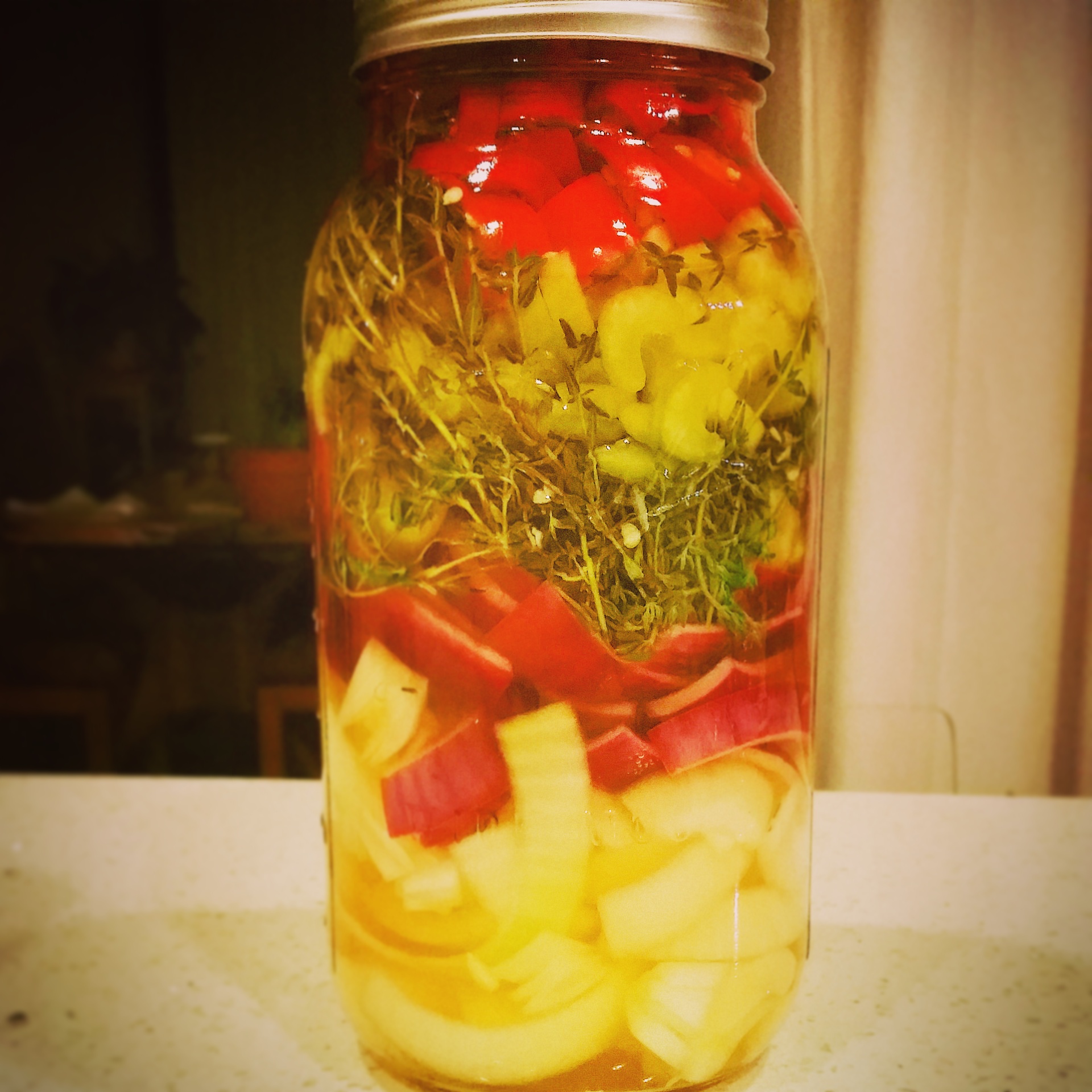 – Stuff your onion pieces into a mason jar or other container with an airtight lid, along with some salt and pepper (1 T salt and 1 t pepper), and any other seasonings you might want to try out (I like various herbs, and red chili flakes).