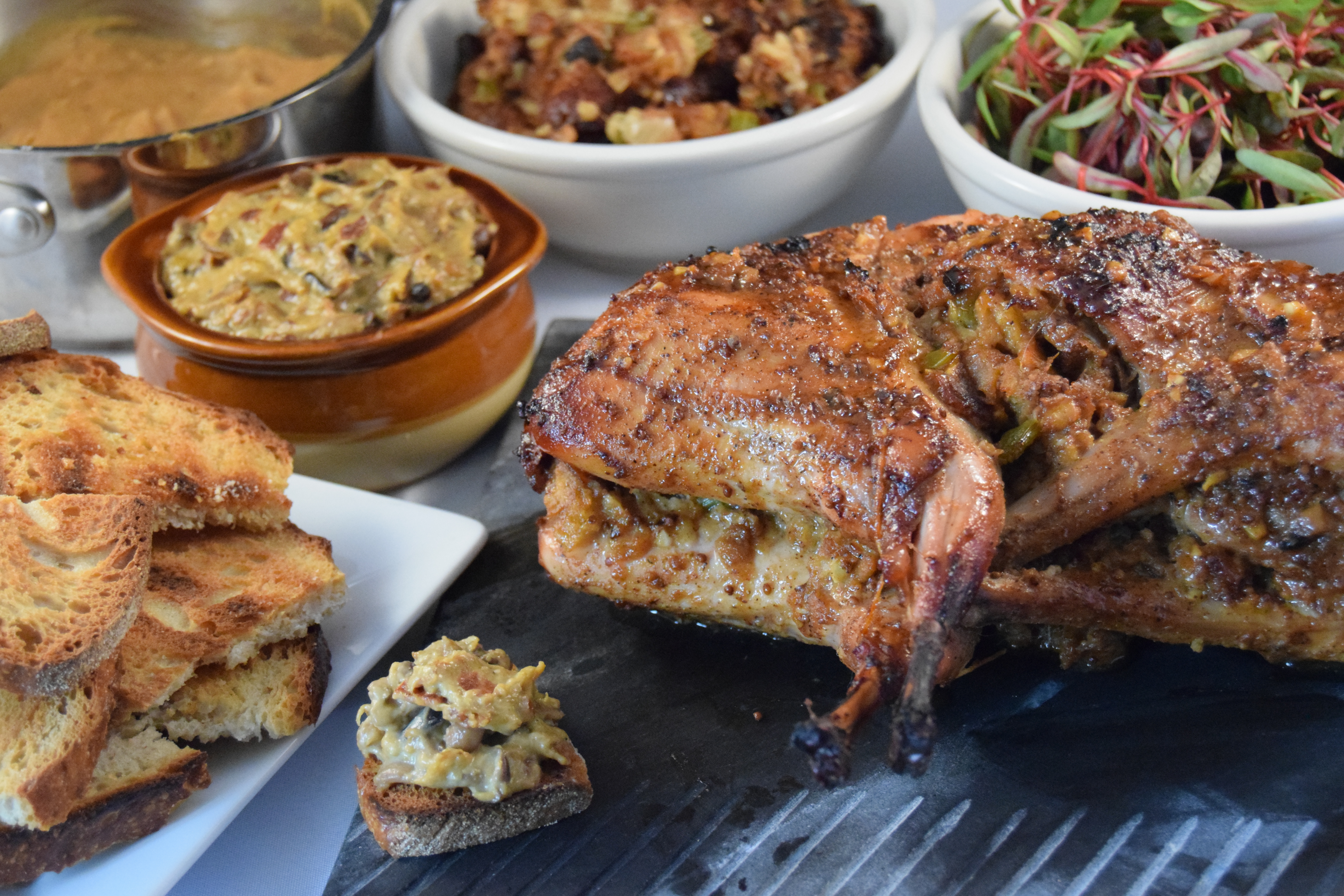Make sure you serve a little “rabbit food” on the side (aka salad). This’ll go well with just about anything that goes well with chicken. I served mine with the offal stuffing, the “rabbit food,” parsnip and sunchoke puree, and toasted sourdough bread with mushroom-leek-bacon-mascarpone dip (don’t worry, the recipe for that is forthcoming), but you honestly can’t go wrong.