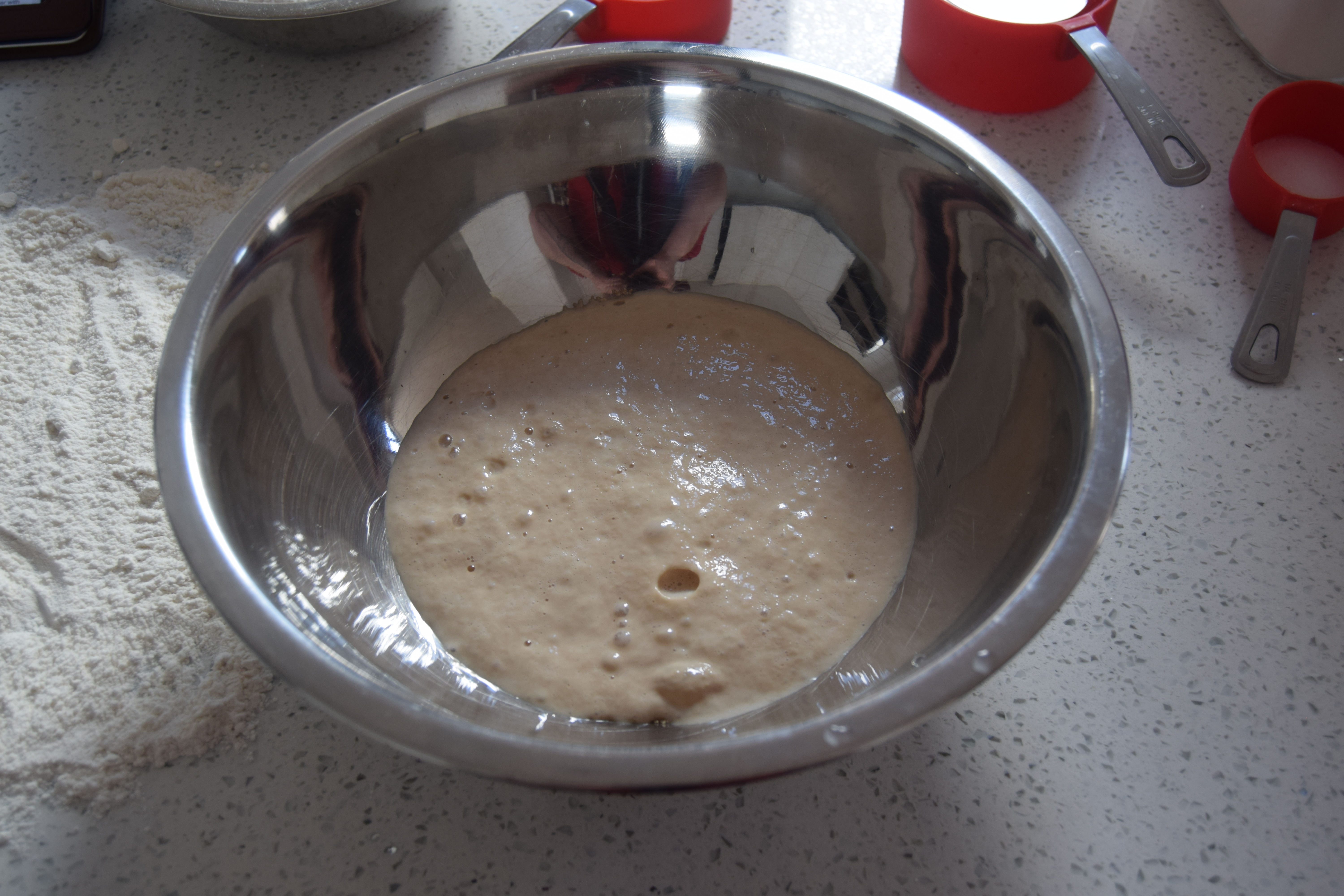 – Put the yeast into a large mixing bowl, and gently add the warm water. Let that sit until it’s good and foamy, about 10 minutes. Make sure you have it in a spot that’s not cold (eg: don’t put it in the fridge or next to an open window on a breezy day, etc.)