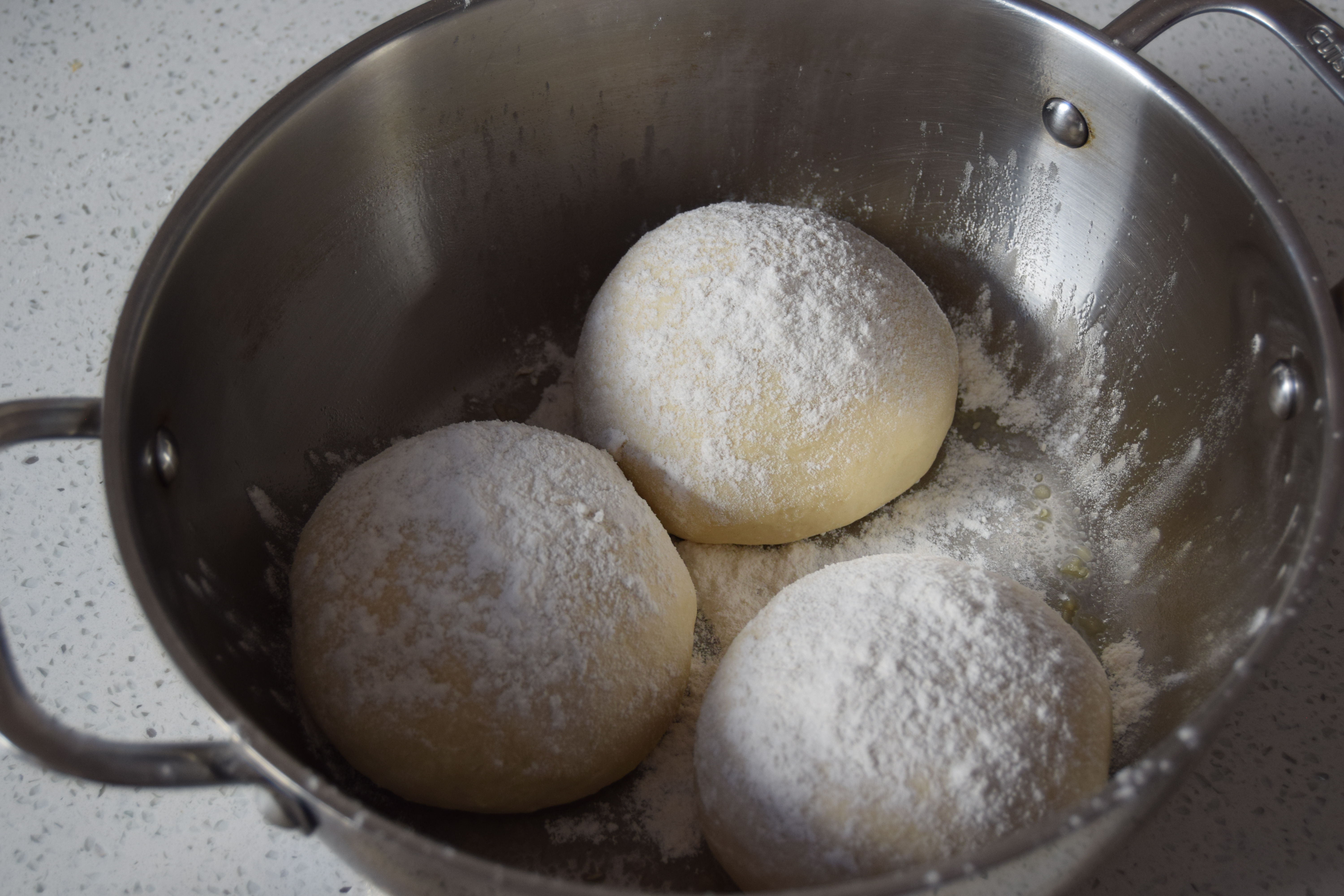– Cut your dough into three equal portions. Knead them for about 2 more minutes, and then roll each portion into a smooth tight little ball. The dough needs to rise for an hour now; if you can give up the workspace for an hour, do the same thing with a little sprinkle of flour and the towel on top. If, like me, you need that space to prep the rest of your pizza stuff (like sauce and toppings), you can put them on a platter or wood board, just make sure you put some flour down for the dough balls to sit on top of.
