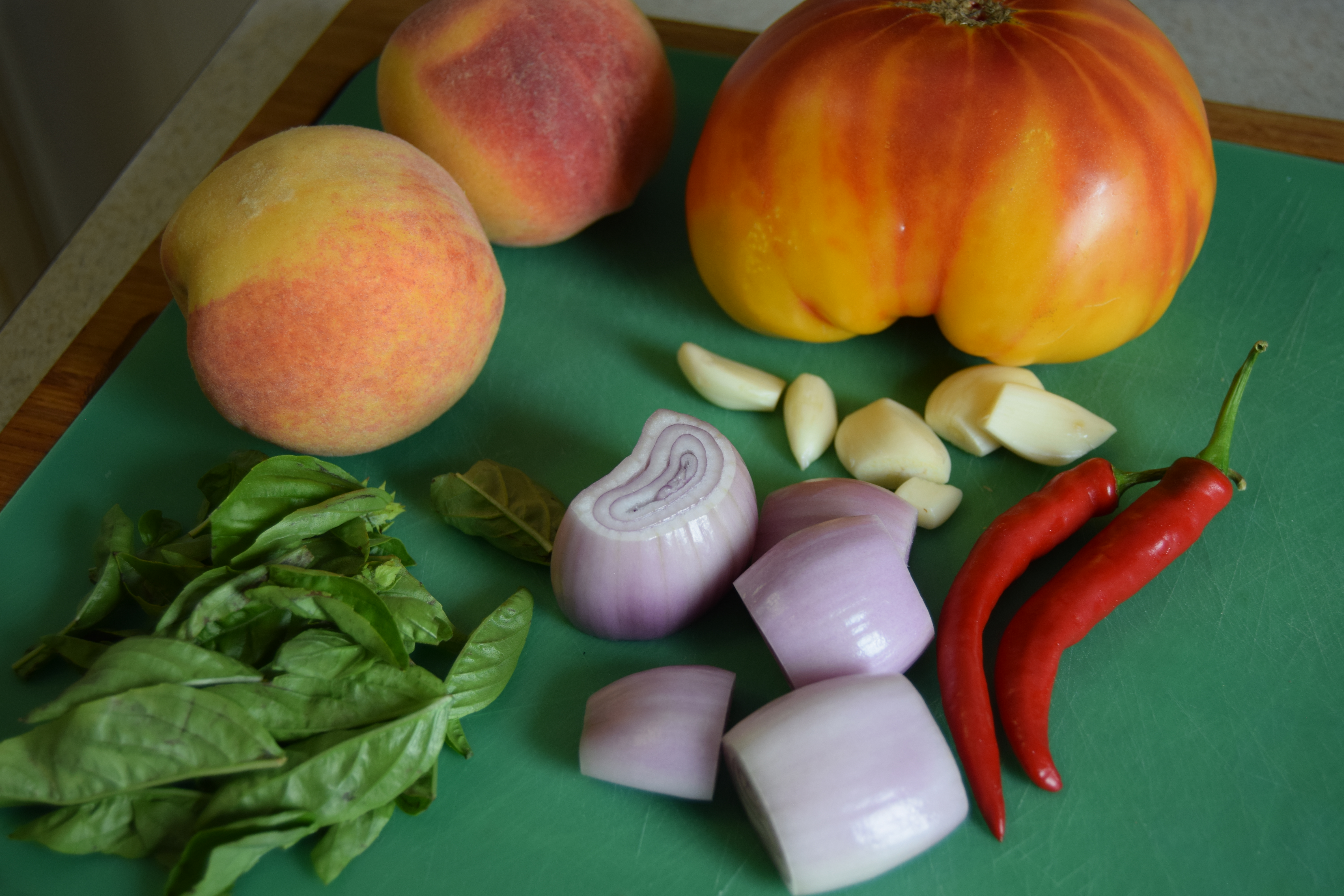 If you go to a farmer’s market in NYC right now, you’re going to see giant piles of tomatoes and peaches. I saw tomatoes last weekend that had to weigh 4 or 5 lbs. And anytime you see a plethora of a certain kind of produce, well, you know it’s probably in season and at it’s best. So I of course had to buy both peaches and tomatoes. Initially I was going to make a peach and tomato salad with some burrata and balsamic vinegar, but… **yawn**… excuse me. Anyways, that seemed a little bit boring. But I still wanted all those things together.