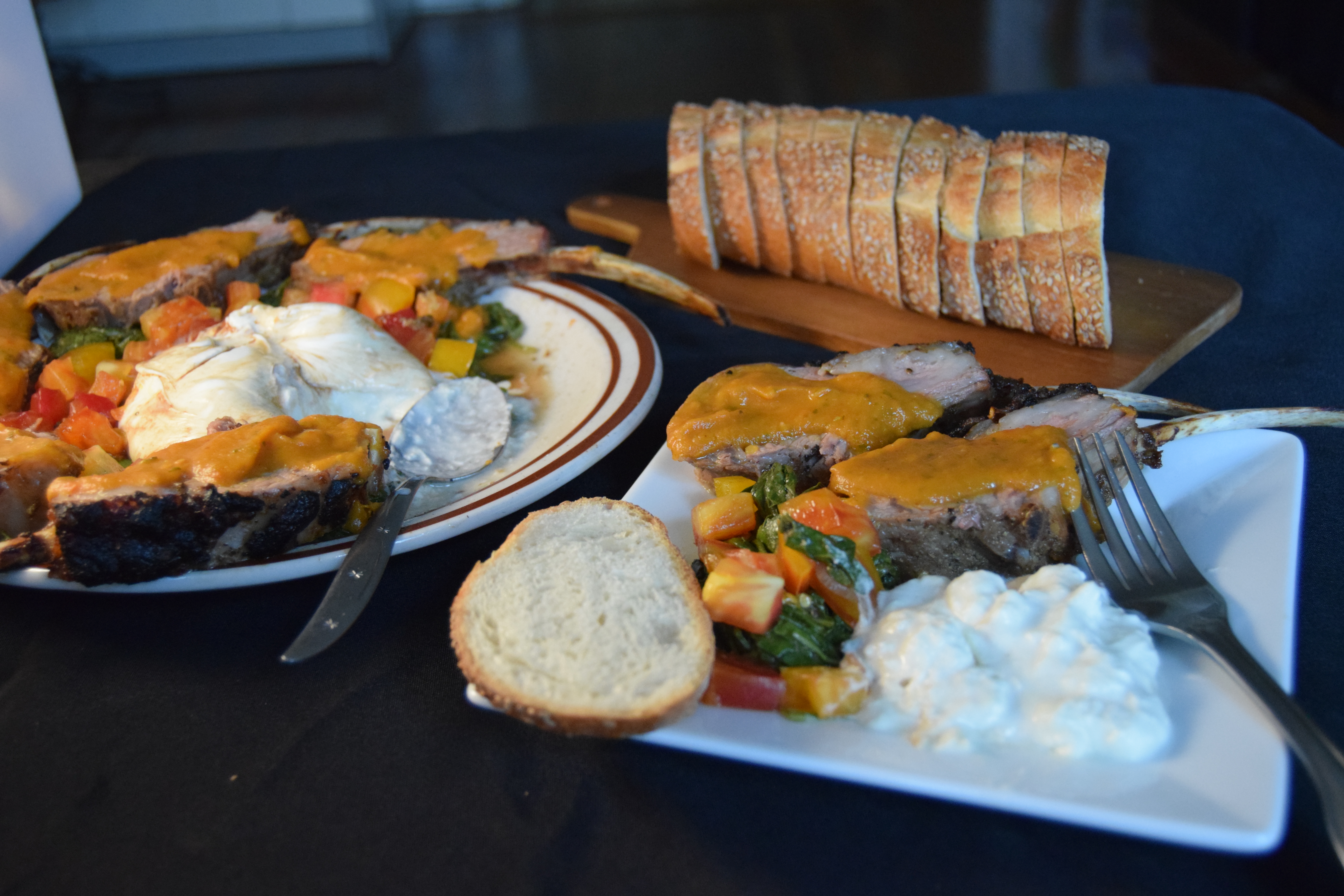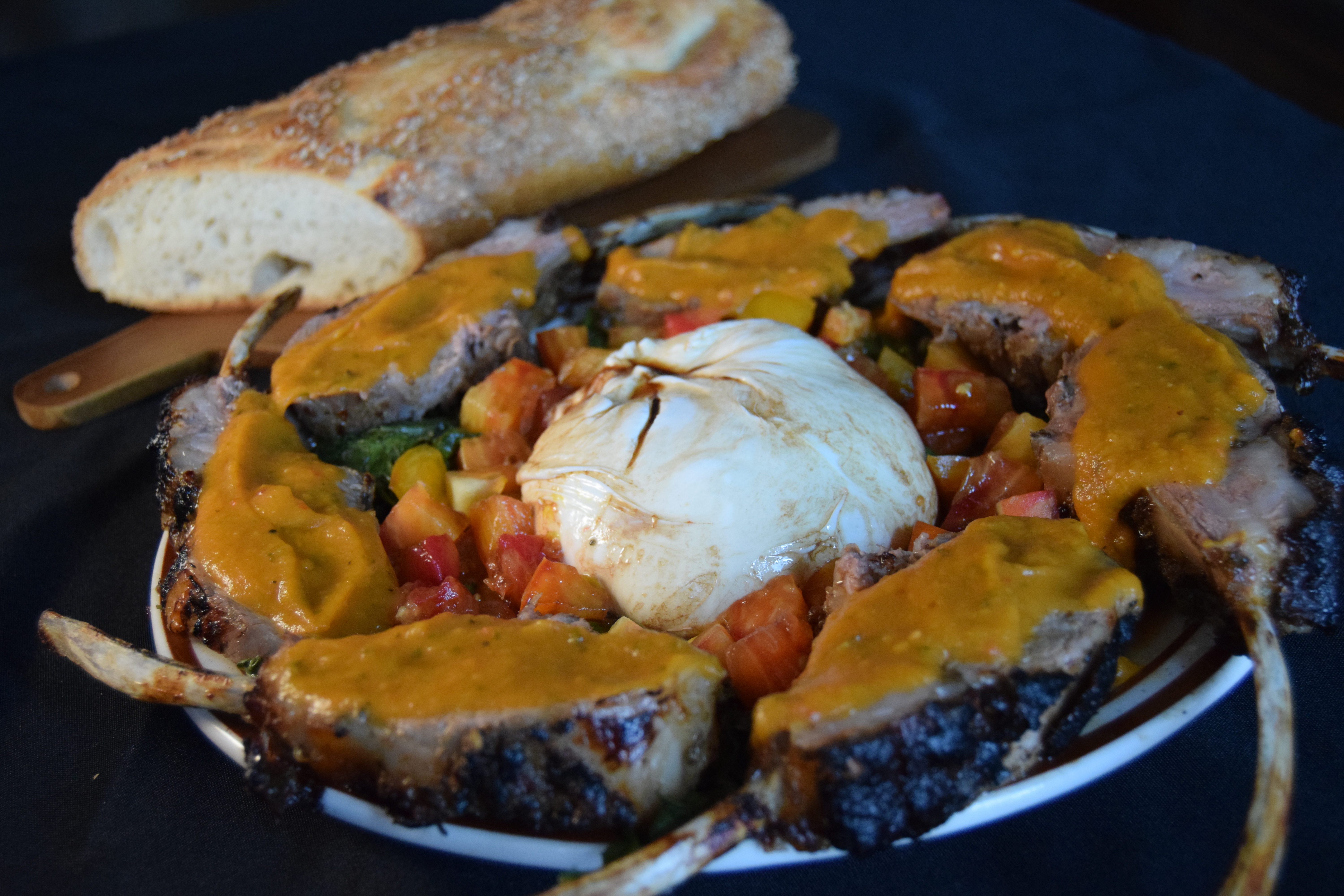 One way I like enjoy fresh tomatoes is in a really simple sauce. When you taste a sauce with perfect in-season tomatoes, it really makes a difference. And I thought, if peaches and tomatoes go well together for a salad, why not together in a sauce? I have to say, I’m glad I had that line of thinking and went with it, cause this sauce is amazing. I added in some fresh cayenne peppers I also found at the market, and it’s perfect on the herbaceous roast lamb; a little burrata with balsamic vinegar and wilted arugula ties the whole thing together.